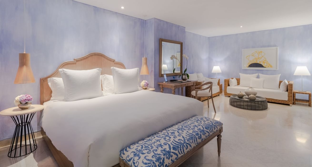 Elegantly designed suites in the Republican Building with spacious living areas, luxury decor, and large windows showcasing the main Republican Courtyard.